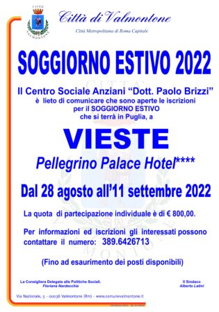 Centro Sociale Anziani di Valmontone“Dott. Paolo Brizzi“ rende noto che sono aperte, fino ad esaurimento dei posti disponibili, le iscrizioni per il soggiorno estivo che avrà luogo in Puglia, e precisamente a Vieste, dal 28.08.2022 al 11.09.2022.