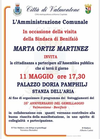 Nella giornata di mercoledì 11 maggio 2022, alle ore 17:30, a Valmontone – presso Palazzo Doria Pamphili – si saluterà la sindaca Martinez (prima cittadina di Benifaio).