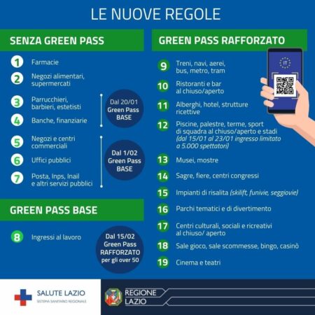 Un’infografica riepilogativa di ciò che è consentito fare, a norma di Legge, in Italia, alla data odierna, 11 gennaio 2022, senza Green Pass, con il Gran Pass Base e il Green Pass Rafforzato.
