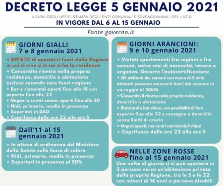 Il Decreto legge “5 gennaio 2021“, in vigore dal 6 al 15 dello stesso mese, ridisegna il Paese in “zone colorate” in materia di contrasto e contenimento del Coronavirus.