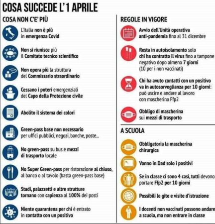 Da venerdì 1 aprile 2022 sono in vigore, in materia di contrasto e contenimento del Covid–19 (Coronavirus), nuove disposizioni.