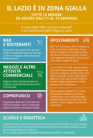 La Regione Lazio, dall’ 11 al 15 gennaio 2021, è considerata zona gialla; in materia di contrasto e contenimento dell’emergenza epidemiologica da COVID–19.
