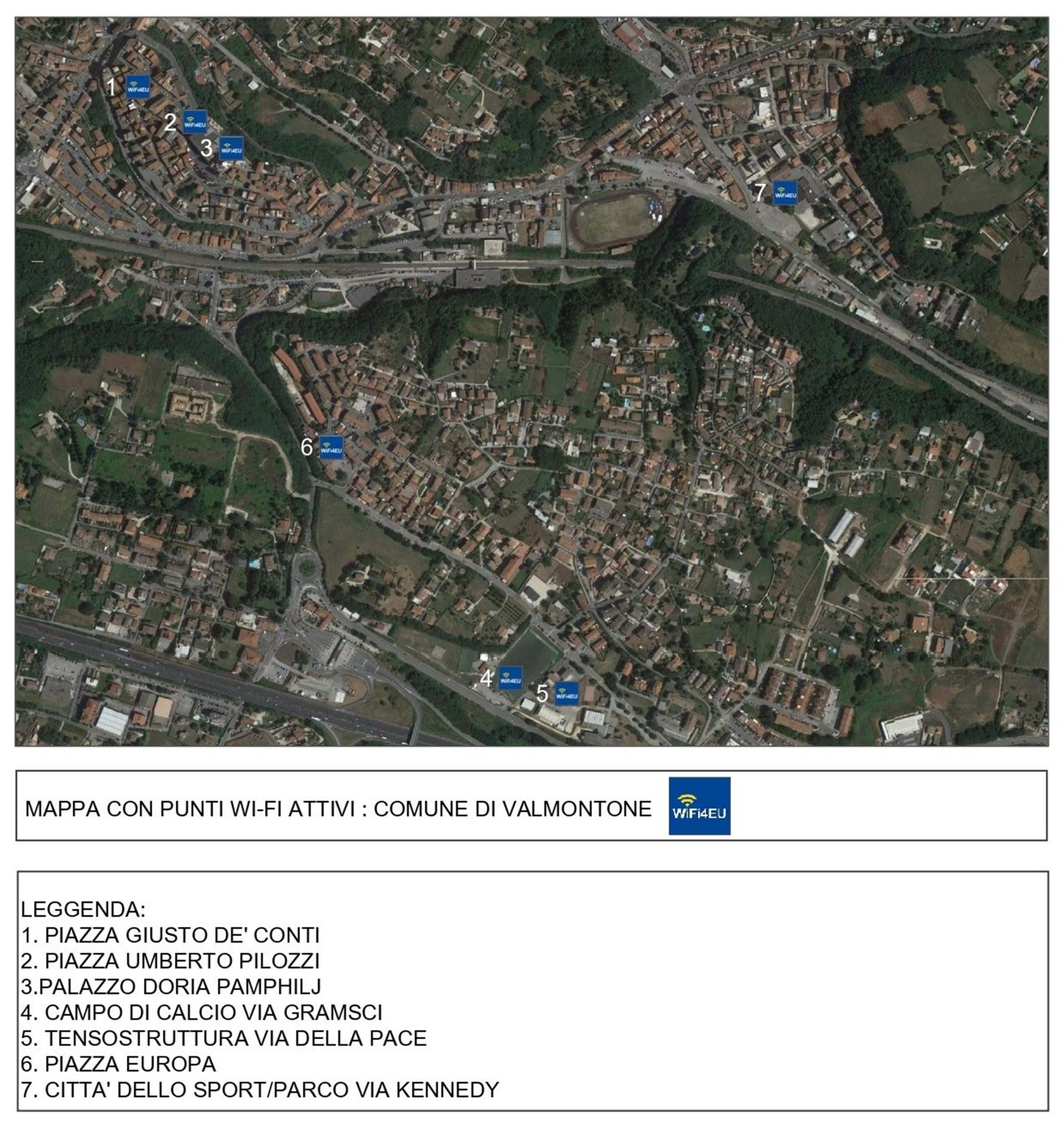 E’ stato ufficialmente inaugurato il 23 ottobre 2020, con l’accensione degli 11 hot spot dell’impianto Wi-Fi pubblico gratuito basato su protocollo WiFi4EU della Commissione Europea. WiFI4Eu è al bando promosso dalla Commissione Europa che mira a fornire ai cittadini l’accesso gratuito alla rete Internet di alta qualità in tutto il territorio dell’Unione tramite hotspot Wi-Fi installati in spazi pubblici (edifici pubblici, parchi, piazze, musei, biblioteche, centri sanitari). Partecipando al Bando, il Comune di Valmontone si è aggiudicato un finanziamento di € 15.000,00 per la fornitura ed installazione degli hotspot Wi-Fi gratuiti.