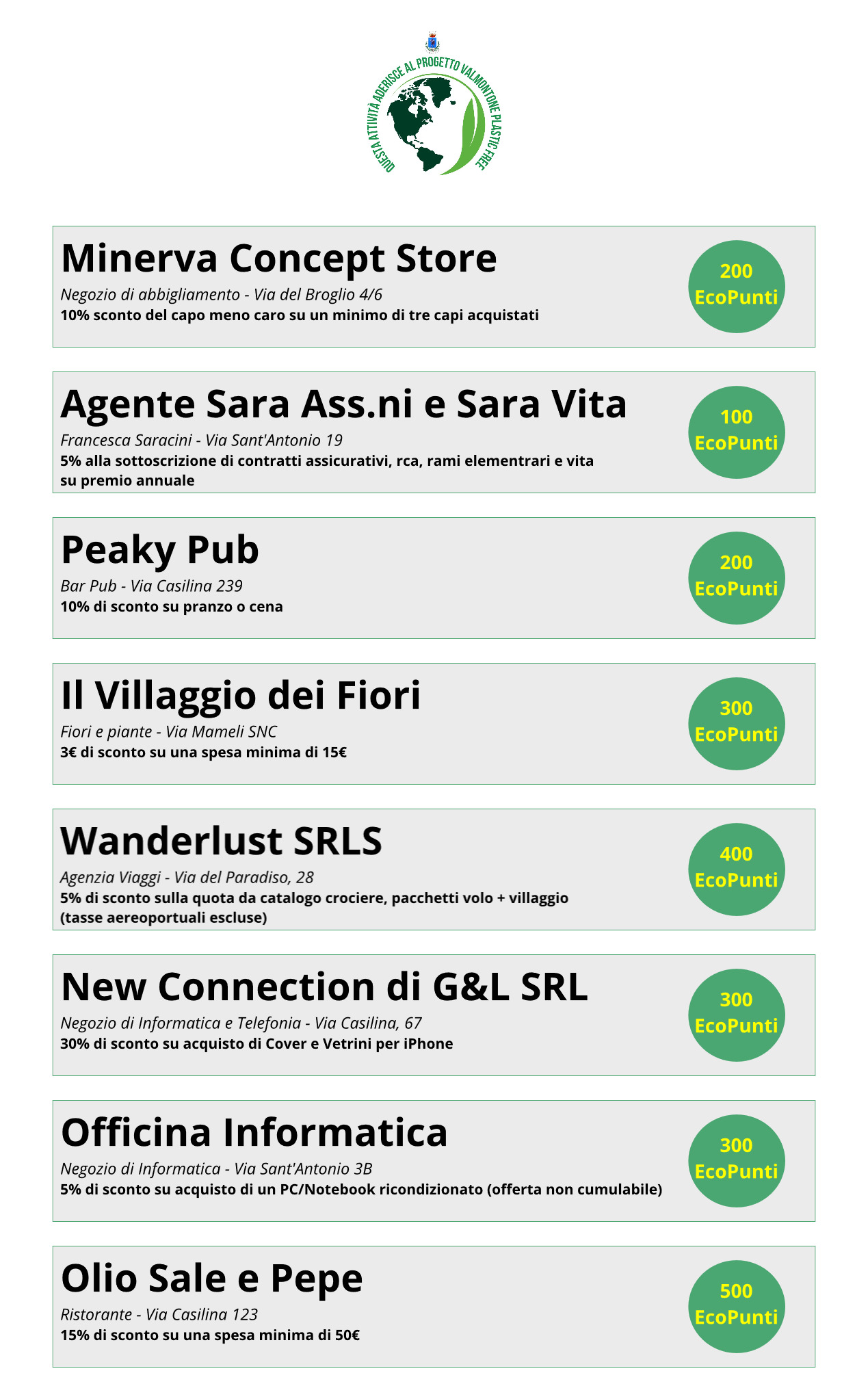 Su ogni scontrino, rilasciato dall’ecocompattatore, c’è il conteggio di PET conferiti che equivalgono a ecopunti. Qui di seguito l’elenco delle attività commerciali e dei rispettivi sconti di cui si può usufruire a seconda del numero degli ecopunti raccolti.